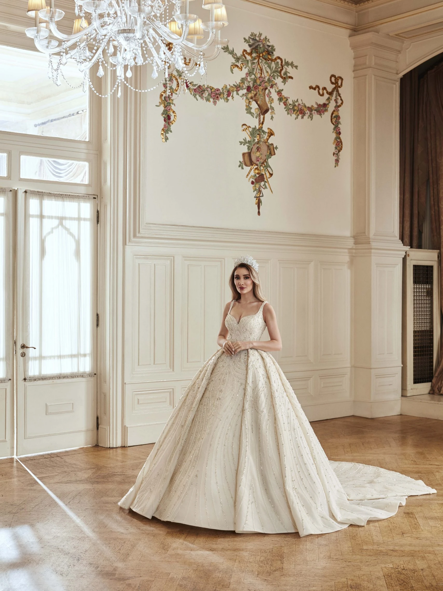 Indulge in the floral elegance of our Floral Elegance in Dark Beige Gown. This captivating dark beige princess wedding dress features a white floral patterned design adorned with shimmering beadings, ensuring you radiate sophistication and charm on your special day.