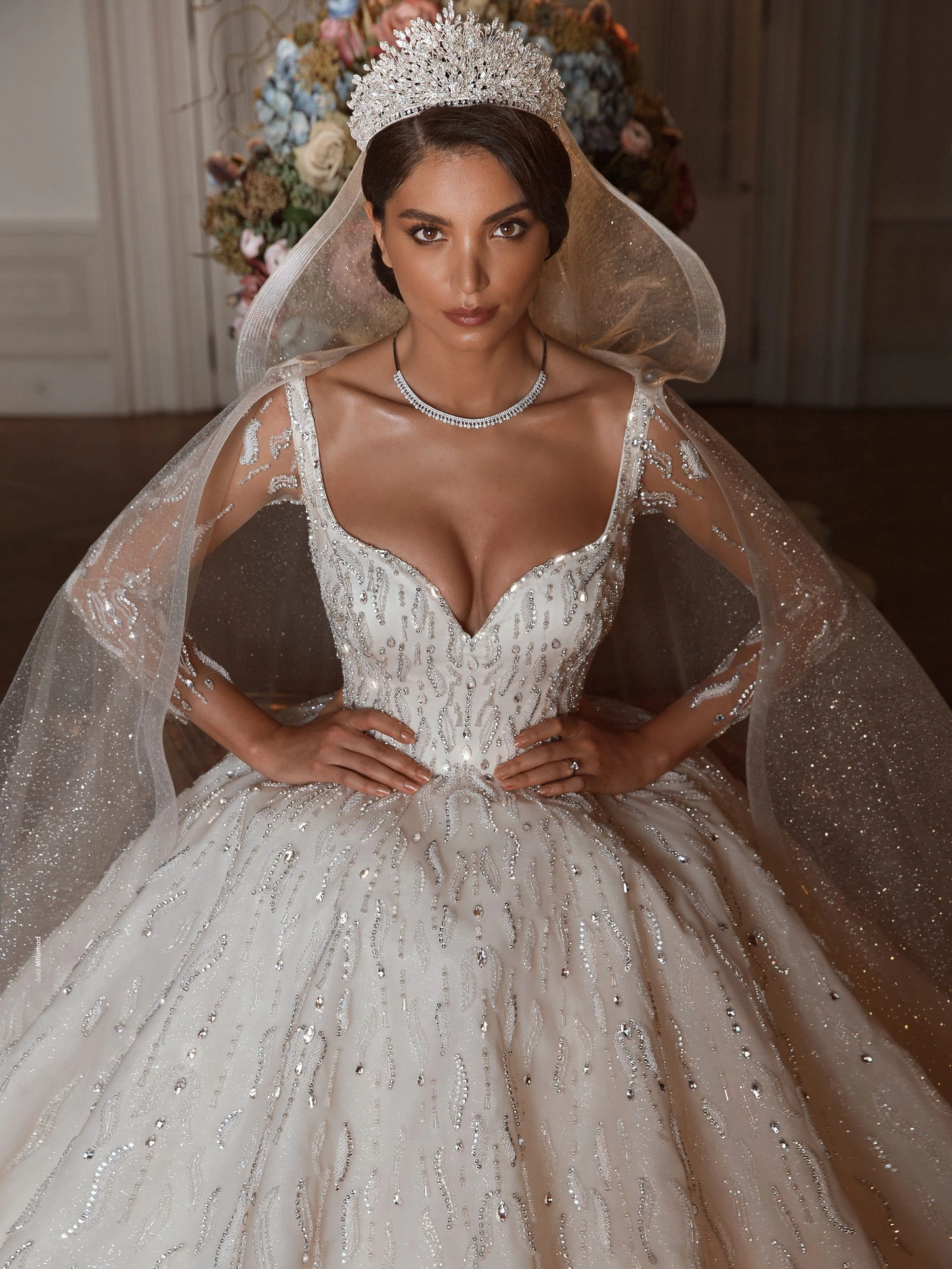 Be captivated by Intricate Tailored Bridal Elegance with our bridal gown. This stunning princess gown features an exquisite handmade embroidery design, adorned with shimmering crystals, ensuring your bridal ensemble exudes luxury and sophistication. Long sleeves and a long tail complete the opulent look.