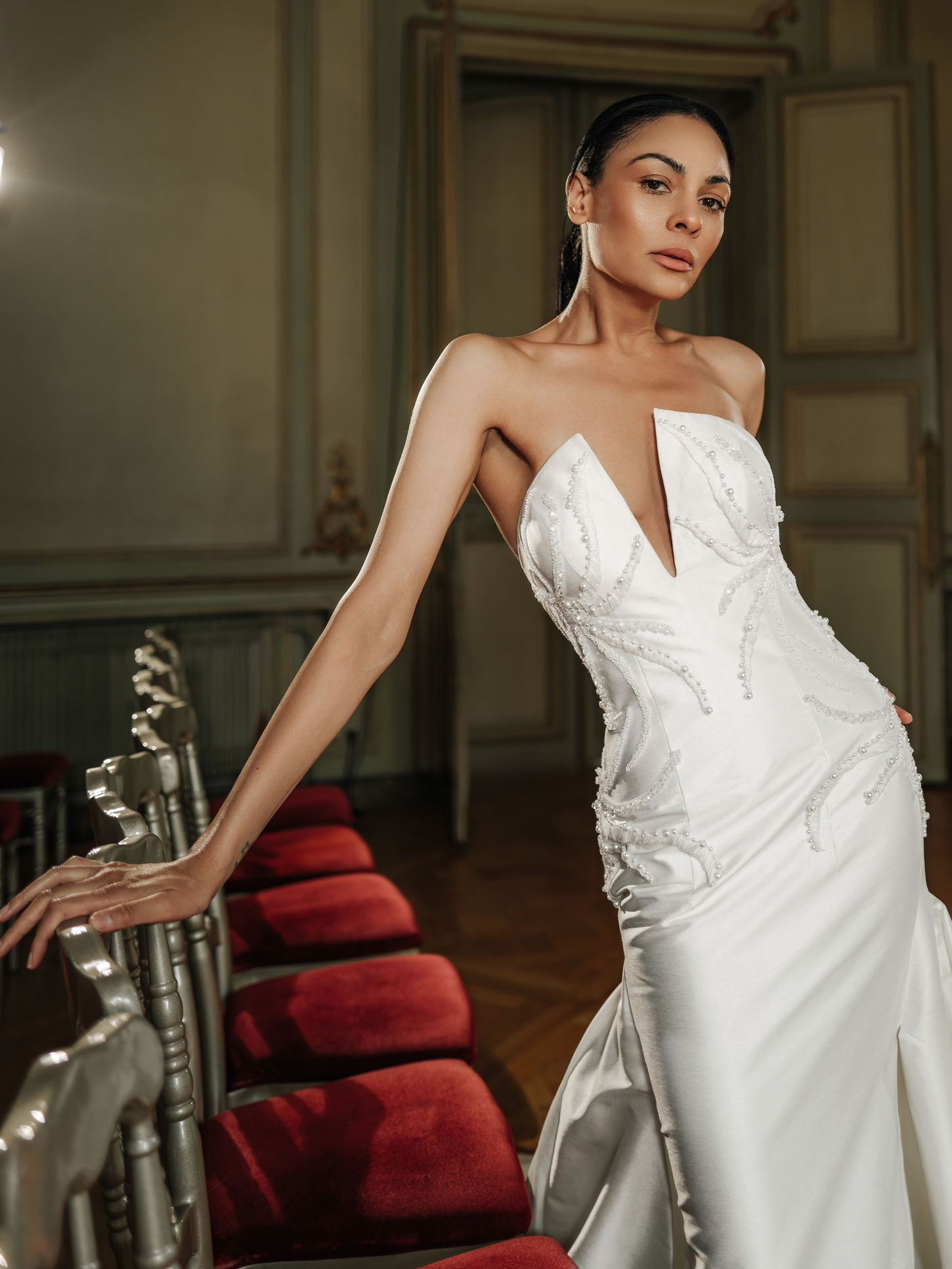 Sophisticated and sleek, this strapless fit-and-flare wedding gown features a daring geometric plunge neckline that exudes modern elegance. The bodice is adorned with intricate handmade embroidery, accentuating the silhouette with delicate, shimmering details. Crafted from luxurious satin, the gown hugs the body beautifully, flaring out into a fixed, dramatic train that adds grandeur to the overall look. Perfect for brides seeking a striking, contemporary design with timeless craftsmanship.