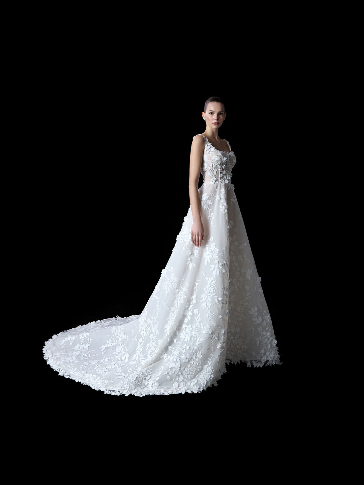 A light-filled silhouette adorned with dimension and softness, features a square neckline and delicate straps, framed in hand-cut 3D floral appliqués that drift across the bodice and cascade over the airy A-line skirt. Crafted in translucent layers of tulle and lace, the gown captures a botanical dreamscape in motion, with a sweeping train that echoes the quiet grace of twilight blooms.