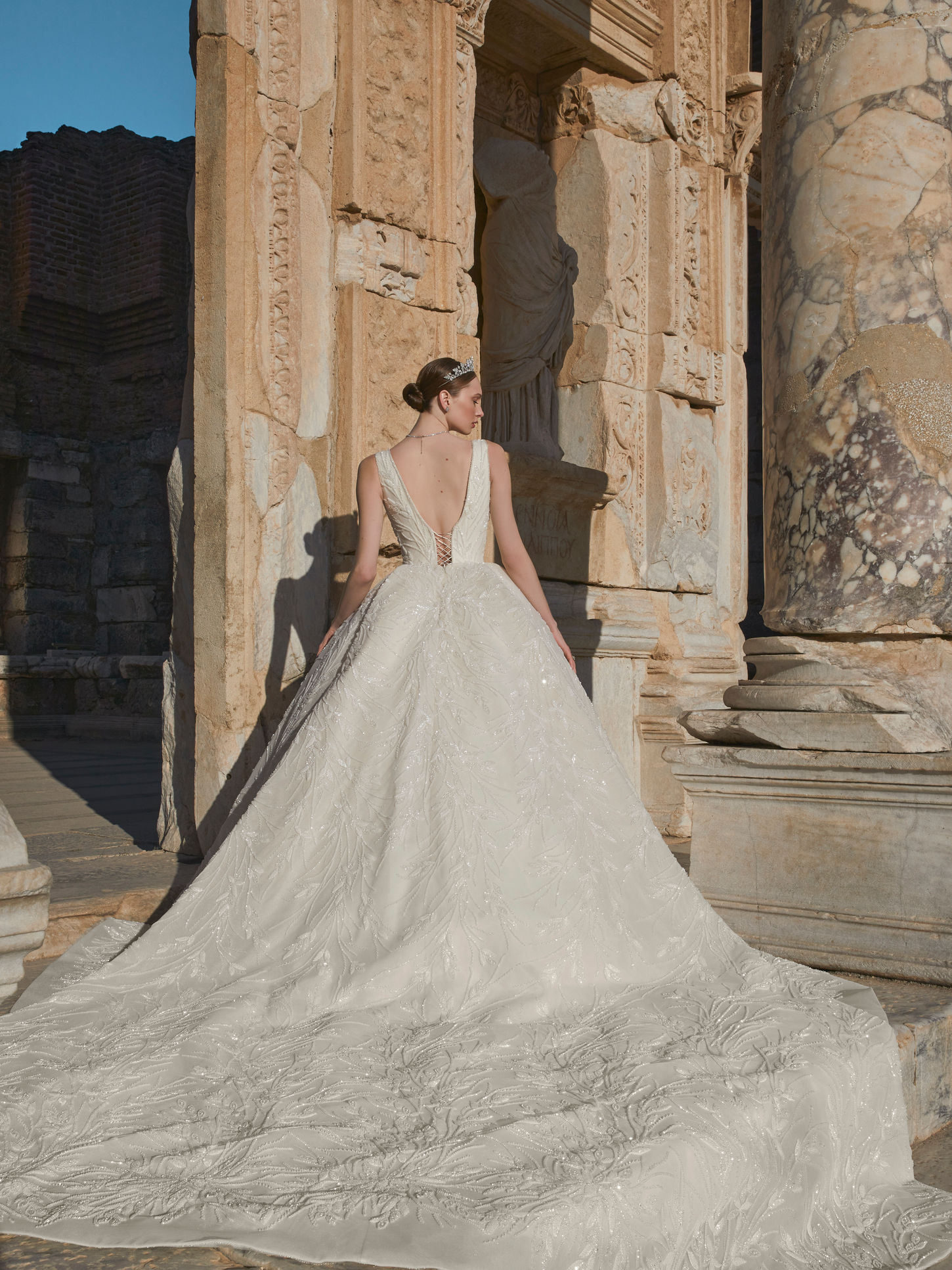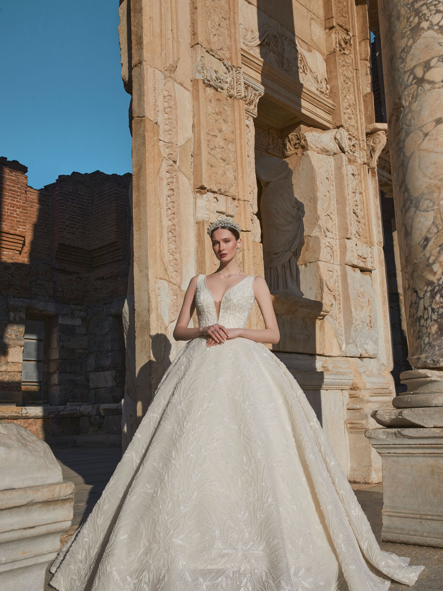 Behold the allure of Ephesus enchantment with our romantic ball gown, a unique choice for lovers of floral bridal dresses. The gown's beauty lies in the exquisite floral applique, material blend, and daring plunging neckline. Available in ivory, it's crafted from a perfect blend of smooth lace and flowy tulle, promising an enchanting bridal experience.