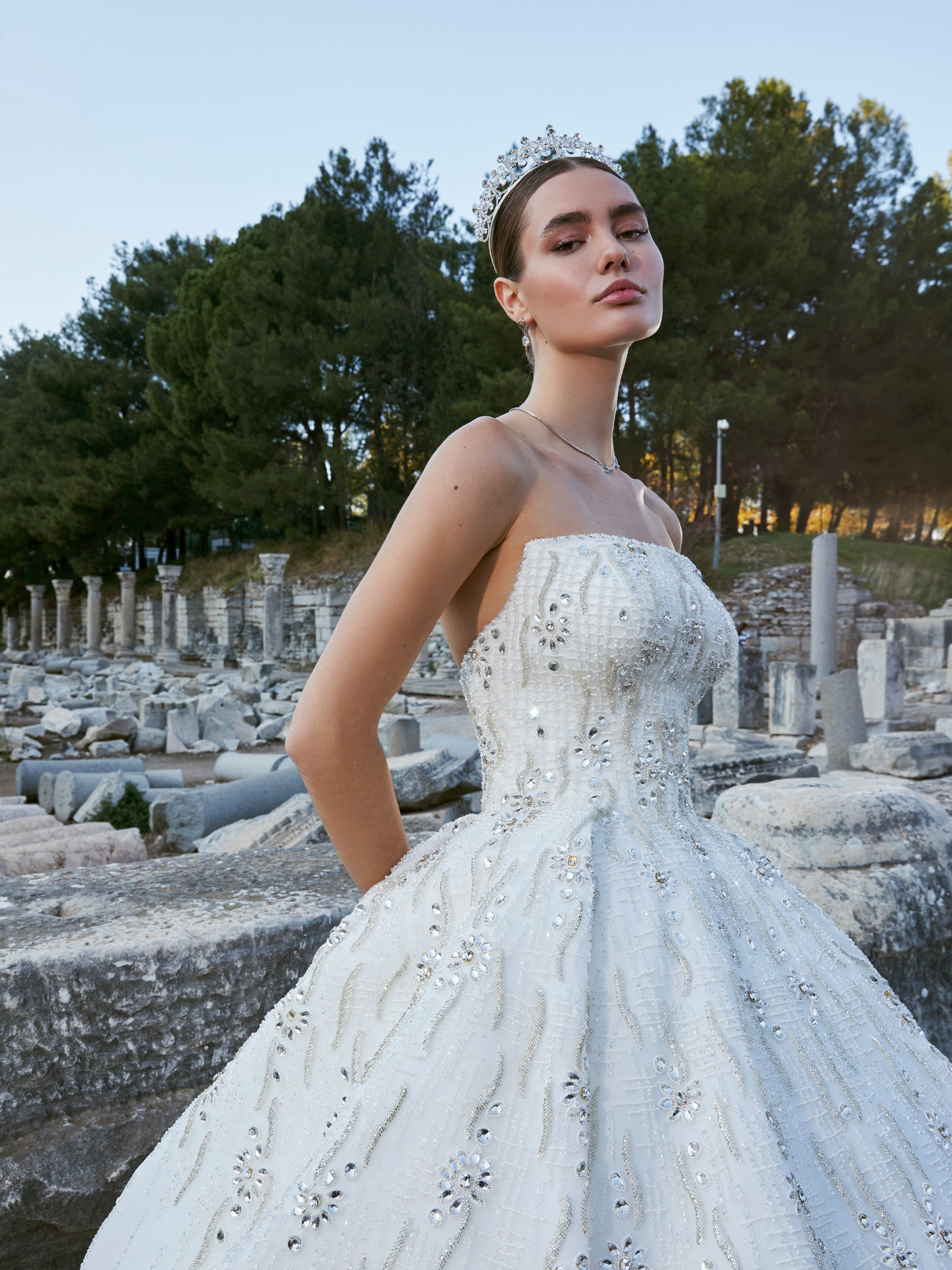 Take up your bridal style with timeless glamour in our off-white crystal floral gown. From the Ephesus collection, this wedding dress features a straight neckline and various crystals that radiate opulence. The crystal floral hand embroidery on the bodice ensures a bridal look that is truly timeless and glamorous.