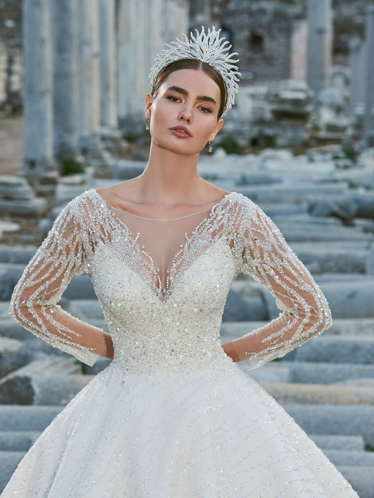 Witness the Ephesus elegance in our dazzling off-white bridal gown. This exquisite dress boasts an illusion neckline and a crystal-covered bodice, adding a touch of luxury to your special day. Shiny lace embroidery creates a vision of shimmering white, while crystal vines gracefully descend the illusion sleeves and wide skirt, crafting an elegant and graceful picture that is truly unforgettable.