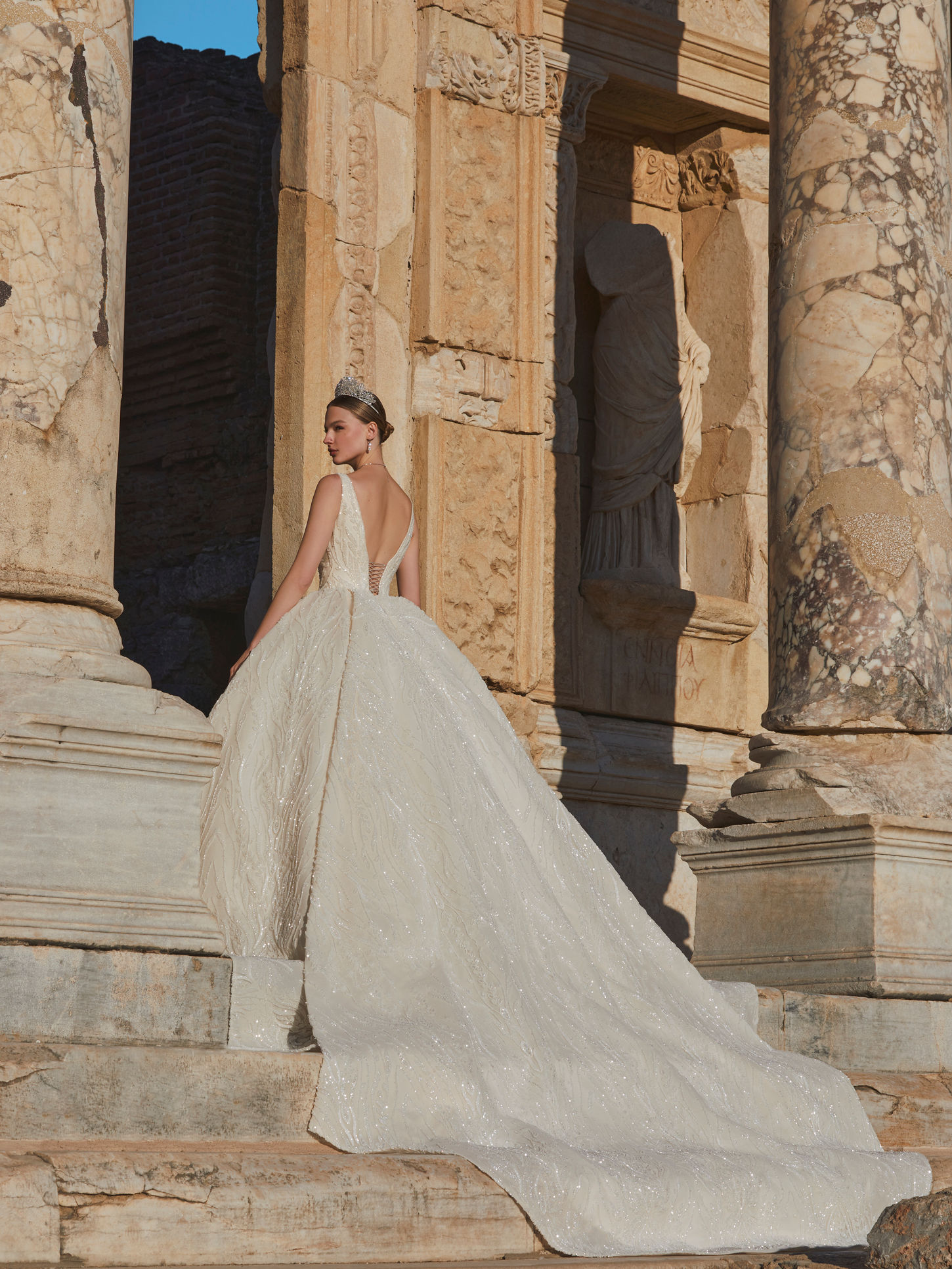Shine in regal sparkle with our ivory-beaded bodice wedding gown. This princess wedding dress, part of the Ephesus collection, showcases an intricate white bead design, offering the perfect amount of sparkle. The ball gown silhouette creates a regal and enchanting bridal look.