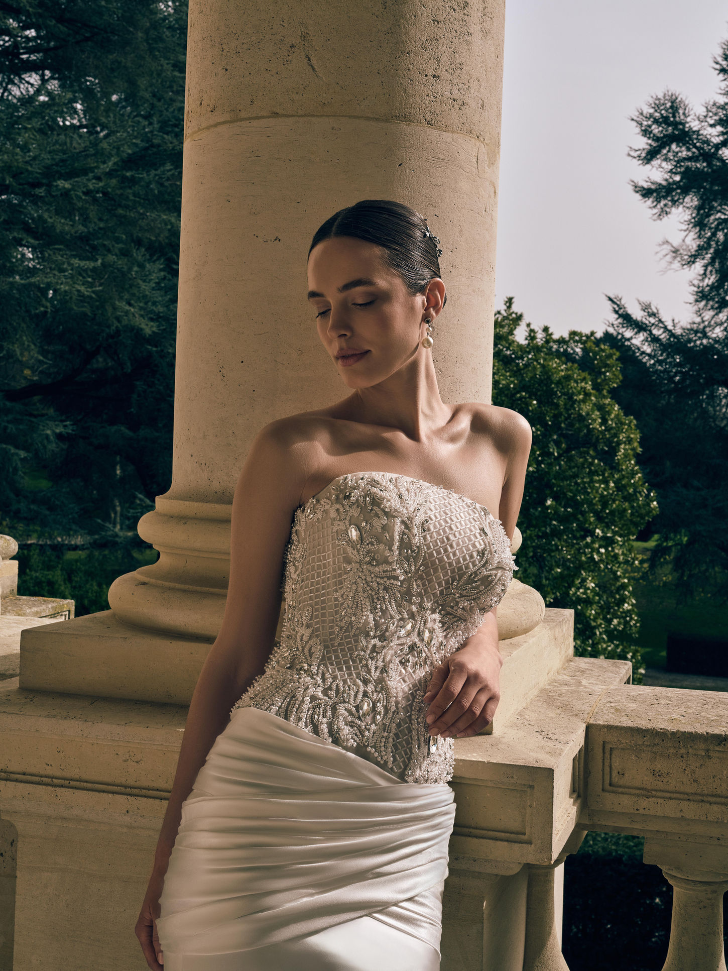 This strapless mermaid wedding gown features a structured corset bodice adorned with intricate hand-applied bead and crystal embroidery. The detailed embellishment highlights the sculpted silhouette, adding luminous texture and refined couture dimension. A softly draped satin panel at the waist transitions into a sleek mermaid skirt, creating fluid movement and elegant balance. A sophisticated bridal design for brides seeking sculpted structure enhanced with radiant hand-embroidered detailing.