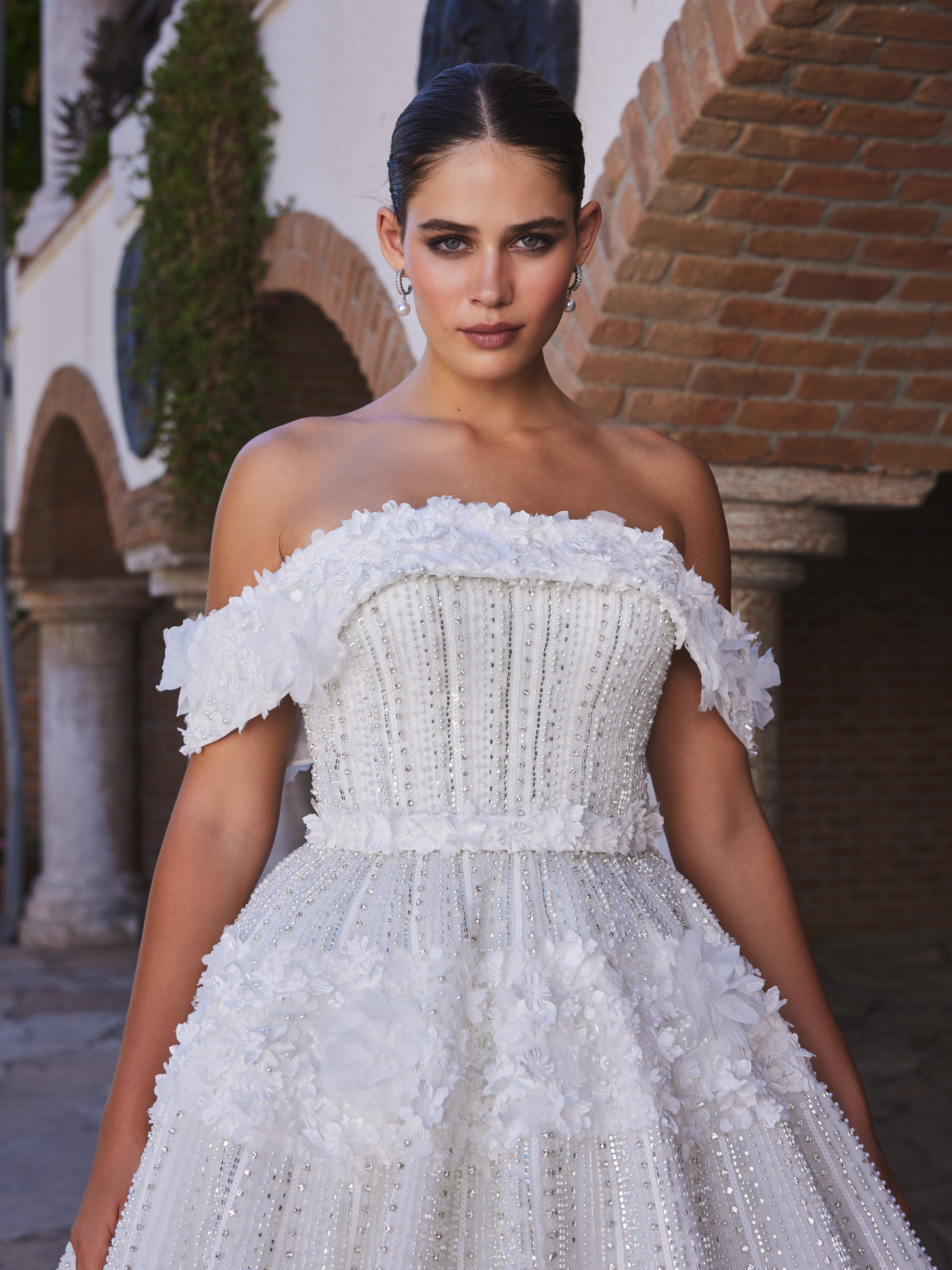 Experience the allure of our off-the-shoulder gown, exquisitely adorned with embroidered pearls and crystals. This off-white dress features a stunning 3D handmade floral design, adding a touch of elegance and dimension. The off-the-shoulder neckline enhances its romantic appeal, while the long train creates a breathtaking silhouette. Complete with a matching embroidered veil, this gown is perfect for the bride who desires a timeless and unforgettable look on her special day.