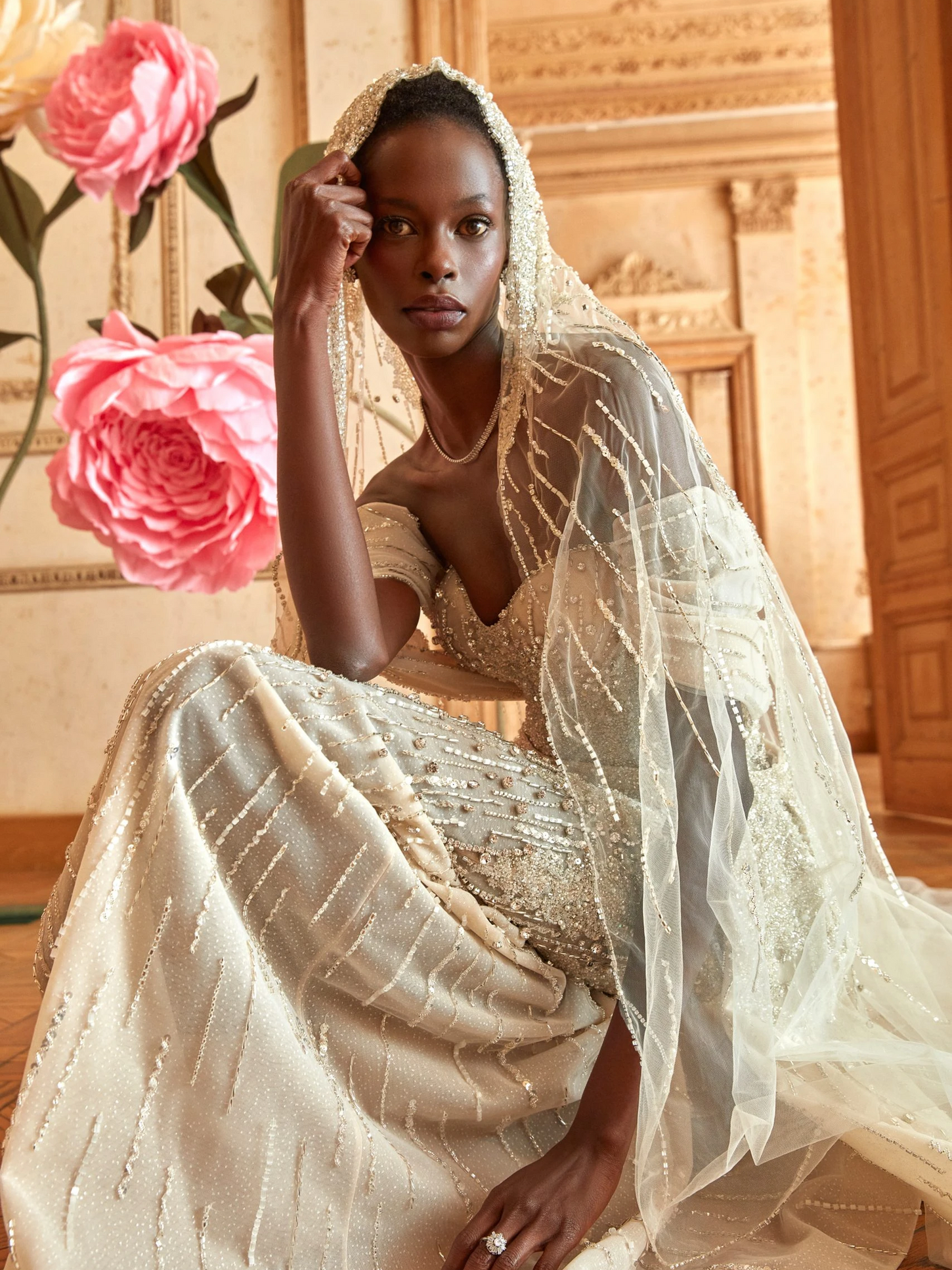 Steal the spotlight in our cream-coloured mermaid wedding dress. The off-the-shoulder neckline radiates elegance, while the enchanting crystal embroidery adds a touch of magic. With a detachable skirt, create endless looks and make a captivating statement on your special day.