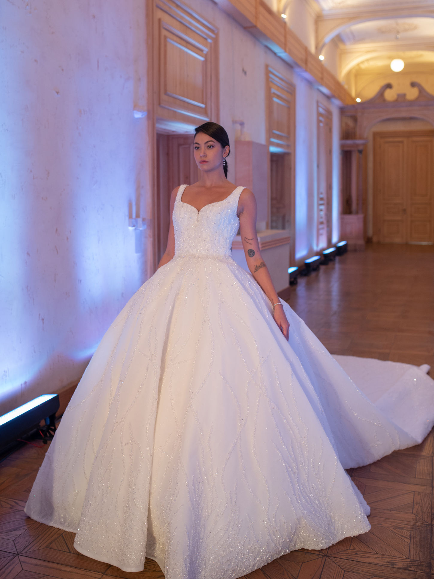 Our Princess wedding dress, in pure white, showcases a majestic long tail and a mesmerizing white beaded shimmering handmade design. It exudes captivating bridal splendor, perfect for your special day.