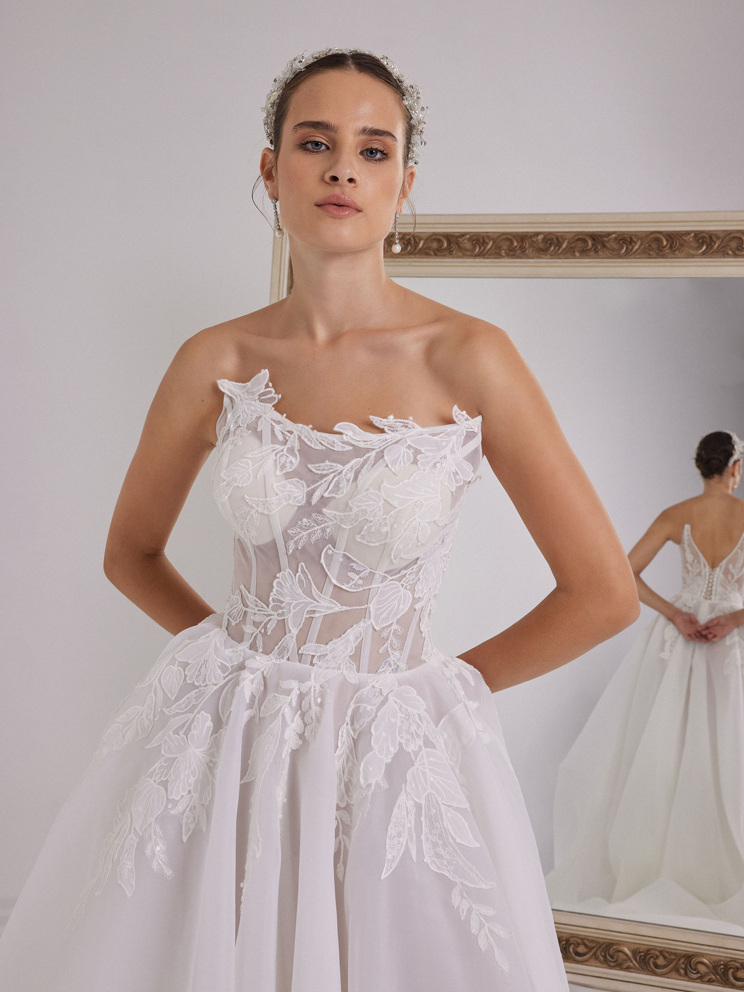 Our floral A-line wedding dress features a breathtaking design, with a beautifully flowing skirt. Fall in love with its ethereal charm and enchanting floral details. Explore our collection and find the dress of your dreams.