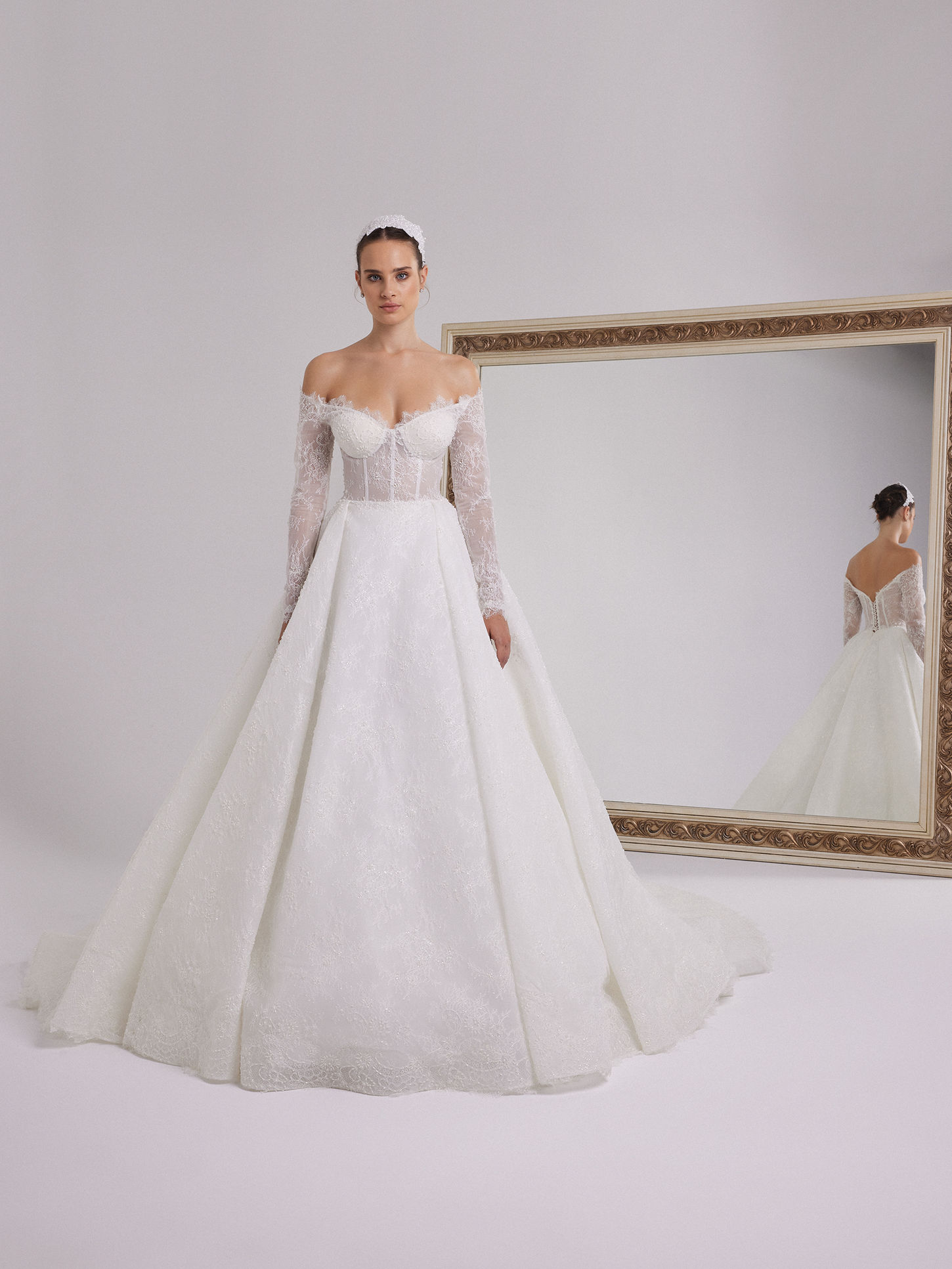 Indulge in the elegance of our white princess wedding gown, featuring a romantic open neckline and long sleeves. Crafted with exquisite French lace, this gown hugs your body beautifully, creating an unforgettable bridal look. Immerse yourself in the light and timeless texture of French lace and make a statement on your special day.
