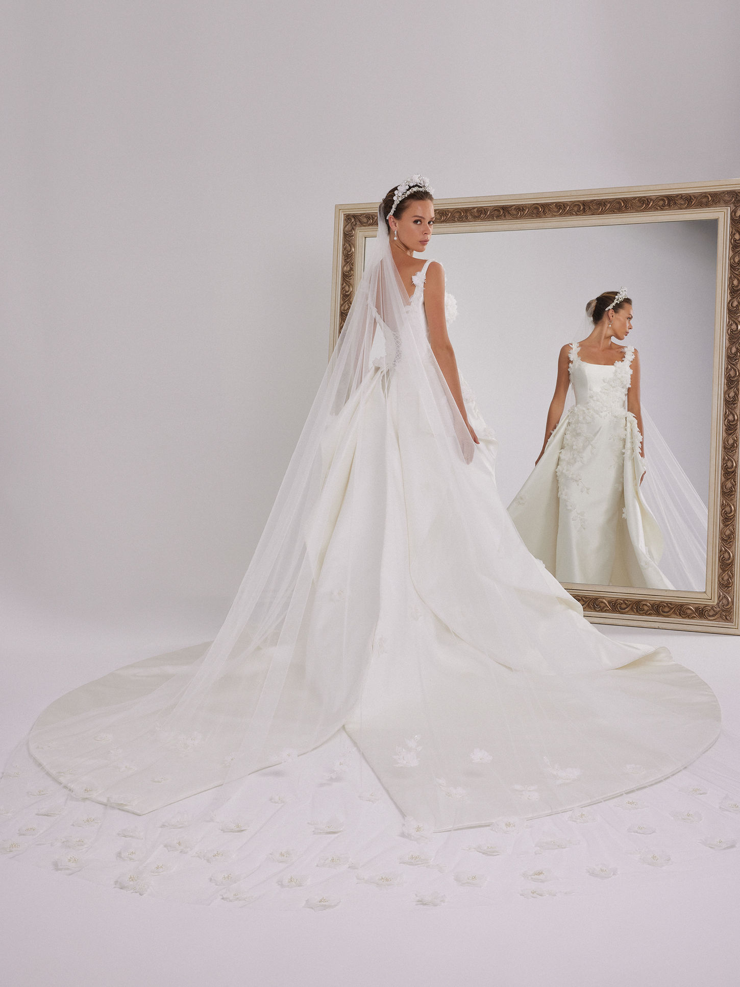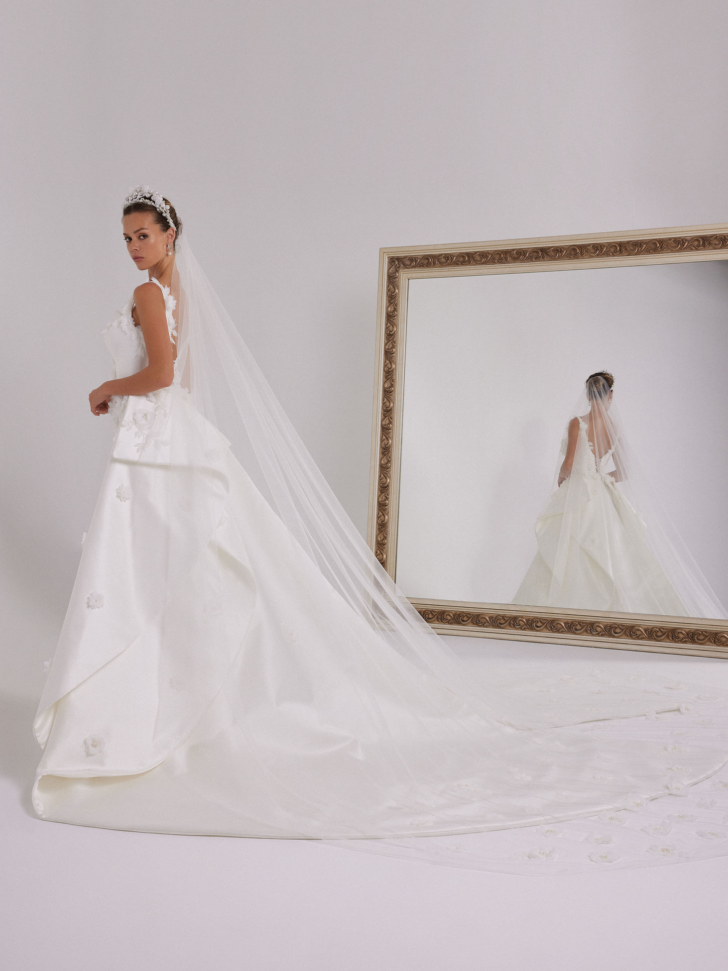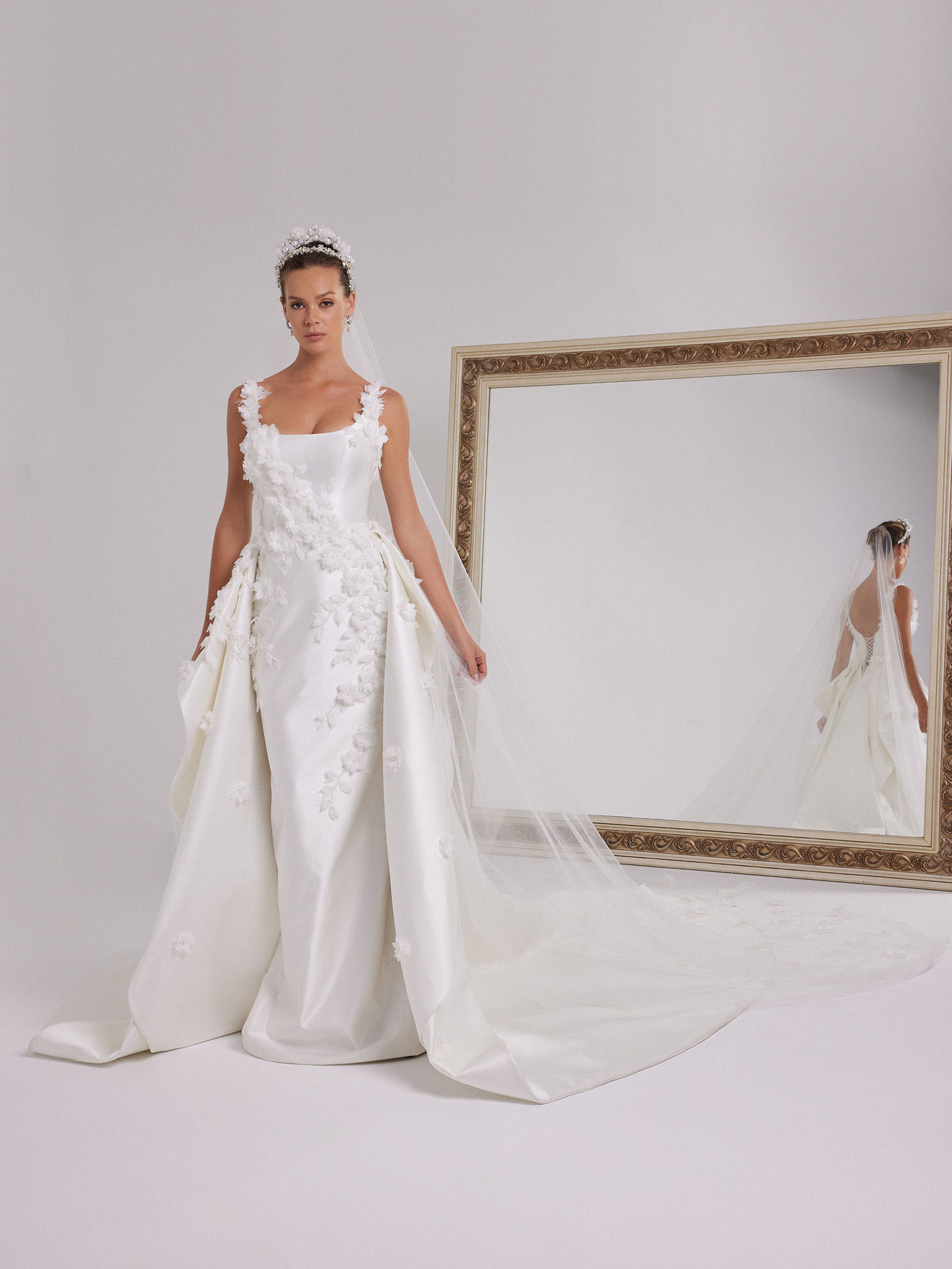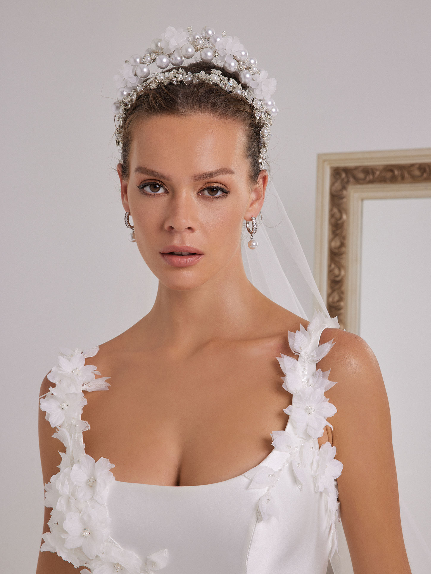 Make a breathtaking entrance on your wedding day with our luxurious off-white satin mermaid wedding dress. The gown is designed with flowing flowers that cascade from the shoulders to the skirt, adding a romantic and enchanting touch. The straight mermaid silhouette beautifully emphasizes your figure, while the voluminous skirt with a long train offers an unforgettable bridal look. The asymmetrical design and flowers adorning the bodice make this dress truly unique, allowing you to be a romantic and unforgettable bride. Shop now and create unforgettable memories in this stunning mermaid wedding dress.